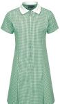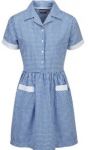 Bottle and White Striped Summer Dress (Reception to Yr 6)Bottle/white striped summer dress - Contrast white trim on sleeves and pockets - Button front with tie belt back - Pointed revere collar - 65% polyester and 35% cotton. May be worn after Easter to October - Half Term only. |